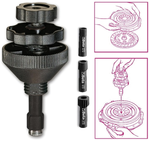Attrezzo UNIVERSALE per centraggio frizioni. Completo di 3 coni ad espansione. Il centraggio del disco-frizione ? effettuato direttamente al banco, operando sul piatto spingi-disco, in modo che le due parti siano rese solidali con l'attrezzo stesso e rimontate sul volano come un corpo unico.