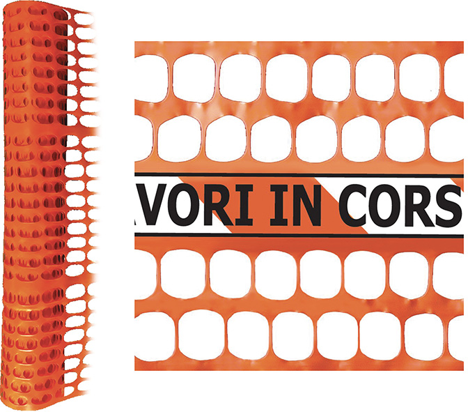 Rete protezione cantiere in polietilene (HDPE) colore arancio. Conforme al codice della strada, sicurezza ed alta visibilit?. Alta resistenza al sole ed alle intemperie. Completa di scritta LAVORI IN CORSO. 150gr/mq circa.