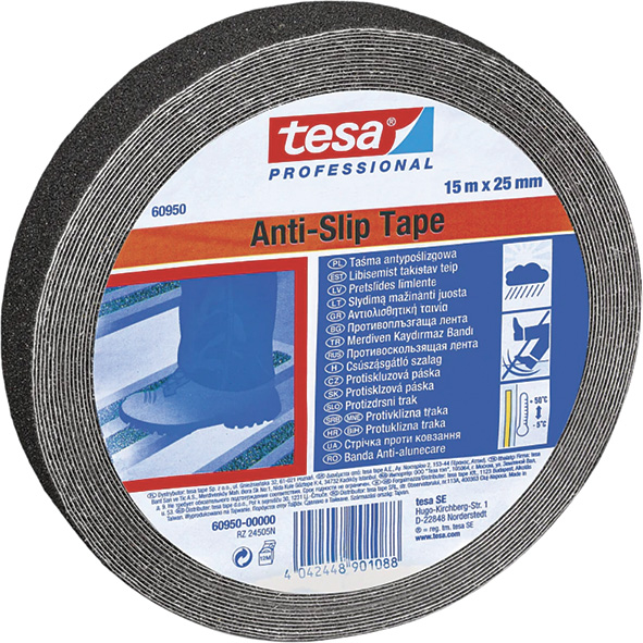 Nastro con supporto PVC rivestito in ossido di alluminio e forte adesivo acrilico. Il robusto e duraturo rivestimento adesivo assicura un elevato effetto antiscivolo fino a un massimo di due anni in zone soggette a un uso normale. Strappabile a mano e removibile senza lasciare residui. Certificato in base alle norme DIN 51130, resistenza all'acqua salmastra e agli agenti chimici.