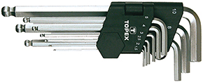 Chiavi esagonali piegate lunghe. Punta sferica BALLPOINT. Chrome-Vanadium. Serie 9 pz: mm.1,5-2-2,5-3-4-5-6-8-10. Confezione blister.