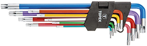 Chiavi torx piegate lunghe COLORATE: ad ogni misura corrisponde un colore. Chrome-Vanadium. Serie 9 pezzi: T10?T50. Confezione blister.