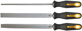 Serie 3 raspe per legno forma: piatta, mezza tonda, tonda. In acciaio T12. Lunghezza mm.200. Manico in plastica antiscivolo. Confezione blister.