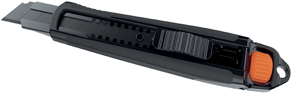 Professionale. Corpo in ABS e bimateriale nero. Lama a spezzare mm.18, spessore mm.0,7 in acciaio SK4 brunito antiruggine, tripla affilatura. Rotella blocca lama con vite di sicurezza. Portalama spessore mm.1,0 per una maggiore durata e minimo rischio di rotture.