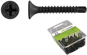 CONFEZIONE BLISTER. Viti autoperforanti fosfatate nere, testa a trombetta, punta a trapano. Impronta Philips n.2. Per il fissaggio di pannelli in cartongesso su supporti metallici spessore max mm.2,0.