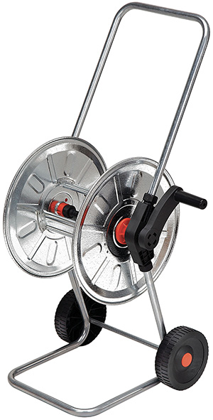Carrello avvolgitubo con ruote. Rullo e telaio in acciaio zincato. Componenti in materiale plastico. In dotazione raccordi universali. Peso Kg.3,9.