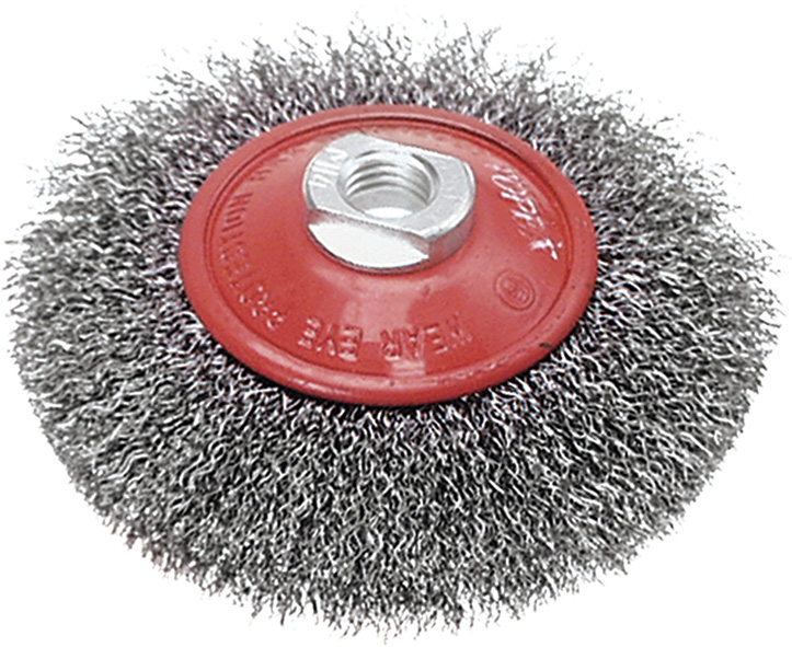 Spazzola metallica con fili ondulati in acciaio. In confezione blister. Foro d.M14.