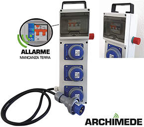CON FUNGO D'EMERGENZA e ALLARME MANCANZA TERRA (mancanza terra segnalata con led rosso e allarme acustico). Scocca in materiale termoplastico. Cavo mt.2 con 1 spina blu 2P+T 16A 230V. Prese 4 blu 2P+T 16A 230V. Interruttore differenziale-magnetotermico 16A.