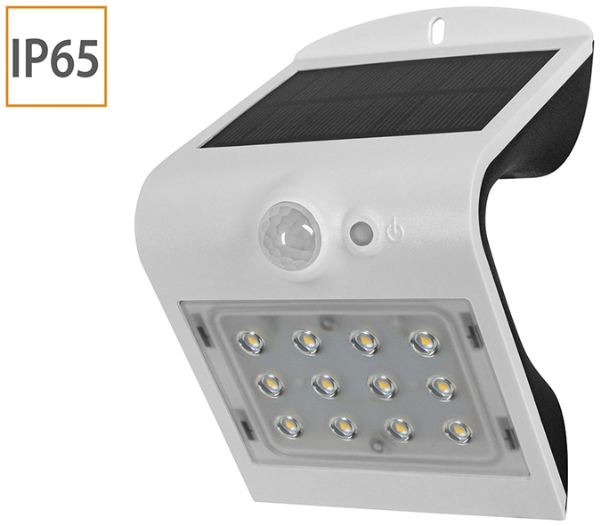Proiettori led SMD ricarica solare. Struttura in ABS e policarbonato anti UV bianco. Con batteria ricaricabile al litio (sostituibile) 3,7V-4000 mAh. Con pannello solare 4,4Wp Mono (tempo di ricarica solare 12/15h). Con sensore crepuscolare di movimento angolo 120? portata mt.6. 2 modalit? di funzionamento. Protezione IP65.