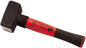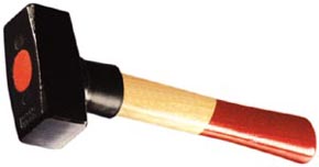 "Testa con collare brevettato in acciaio a norme DIN. Manico brevettato fissato alla testa in modo meccanico ad altissima sicurezza. Struttura in tricomponente: cuneo acciaio per bloccaggio meccanico, anima in lega di alluminio, manico in nylon A2800."