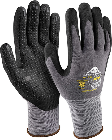 Guanti di protezione contro i rischi meccanici e termici. Colore grigio/nero. Fodera in poliestere. Rivestimento in nitrile nero. Finitura a 13 aghi. Polsino nylon elasticizzato. Certificazione Oeko Tex: assenza totale di materiali nocivi e tossici per la pelle. EN 407:2020 - EN388 3121X.