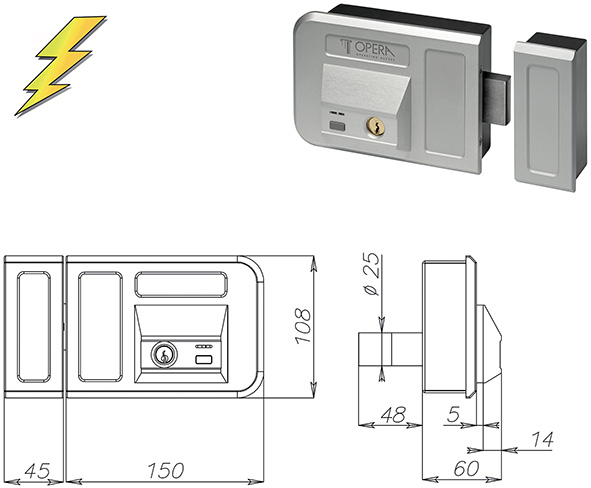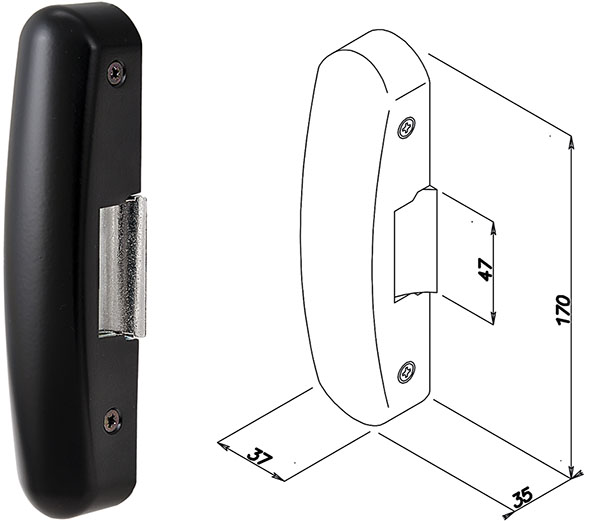 Con antiripetitore interno. Corpo in metallo verniciato nero. Simmetrico e reversibile. Bloccato senza alimentazione. Apertura con l'impulso e richiusura successiva all'apertura dell'anta. Alimentazione 8-12 Vac. In dotazione 6 spessori.