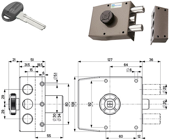 Serratura da applicare verniciata. Laterale con 2 catenacci e scrocco. Entrata 64. Corsa catenacci mm.36. Apertura interna con pomolo. Esterno cilindro C10 L mm.50 con 3 chiavi (92C10B0). Figura mano Dx.