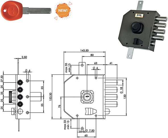 Serratura con cilindro tondo MOIA d.mm.30 L mm.50, con chiave punzonata, pomolo interno. Triplice. 4 mandate e scrocco reversibile. Aste non comprese. Cilindro a 11 perni attivi. In dotazione: 2 chiavi nere disattivabili con la chiave ONE/OFF e 5 chiavi arancio. Chiavi ricambio: arancio ns.cod.843973, nera ns.cod.843964. COMPATIBILE MOTTURA.
