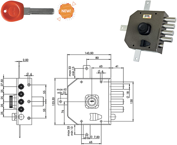 Serratura con cilindro tondo MOIA d.mm.30 L mm.50, con chiave punzonata, pomolo interno. Quintuplice. 4 mandate e scrocco reversibile. Aste e deviatore non compresi. Cilindro a 11 perni attivi. In dotazione: 2 chiavi nere disattivabili con la chiave ONE/OFF e 5 chiavi arancio. Chiavi ricambio: arancio ns.cod.843973, nera ns.cod.843964. COMPATIBILE MOTTURA.