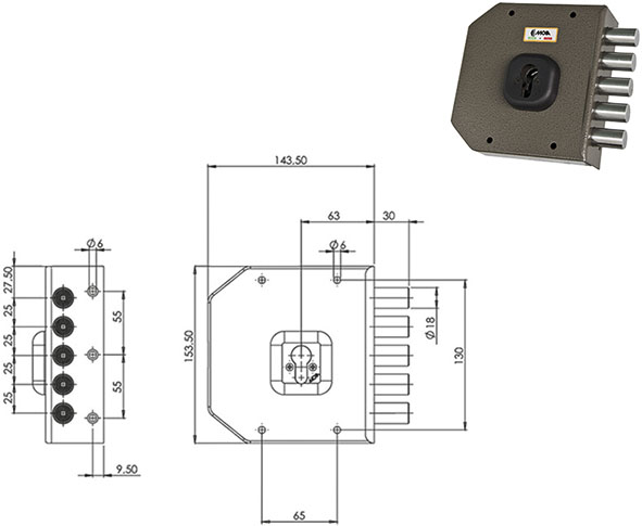 Serratura laterale ad applicare. 2 mandate. Per cilindro europeo. Piastra antitrapano interna e blocco antieffrazione. Cilindro e mostrine non compresi. COMPATIBILE MOTTURA.