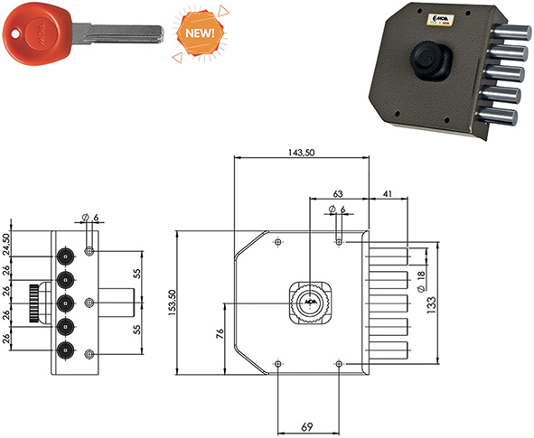 Serratura con cilindro tondo MOIA d.mm.30 L mm.50, con chiave punzonata, pomolo interno. Laterale. 4 mandate. Cilindro a 11 perni attivi. In dotazione: 2 chiavi nere disattivabili con la chiave ONE/OFF e 5 chiavi arancio. Chiavi ricambio: arancio ns.cod.843973, nera ns.cod.843964. COMPATIBILE AUNO ANTONIOLI.