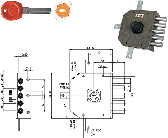 Serratura con cilindro tondo MOIA d.mm.30 L mm.50, con chiave punzonata, pomolo interno. Quintuplice. 4 mandate. Aste e deviatore non compresi. Cilindro a 11 perni attivi. In dotazione: 2 chiavi nere disattivabili con la chiave ONE/OFF e 5 chiavi arancio. Chiavi ricambio: arancio ns.cod.843973, nera ns.cod.843964. COMPATIBILE AUNO ANTONIOLI.