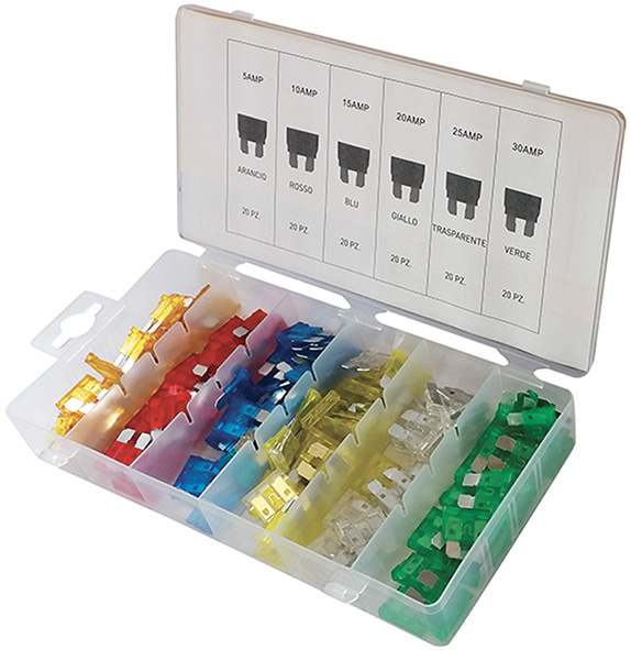 FUSIBILI AUTO assortimento pz.120. Contiene 6 misure: 5A 10A 15A 20A 25A 30A. Confezione blister richiudibile.