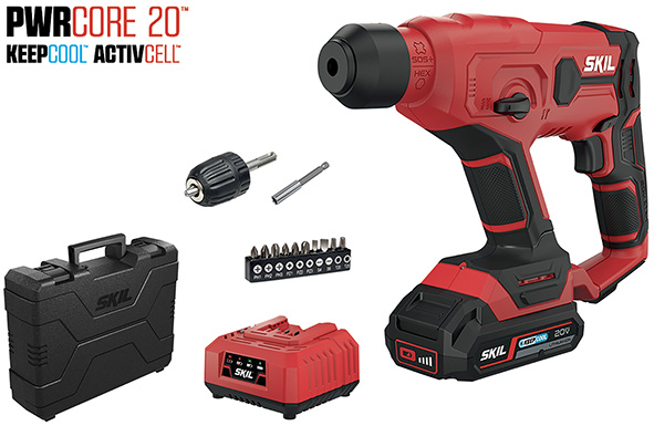 Sistema PWRCORE 20. 1 batteria litio PWRCORE 20V max (18V) 2,0Ah e caricabatterie INCLUSI. Percussione. Compatibile con punte SDS PLUS, esagonali, bit avvitatura. Velocit? 0-900 giri/min. N.max colpi 0-5000/min. Energia impatto 1J. Foratura acciaio-calcestruzzo-legno mm.10-12-12. Luce LED. In dotazione: valigetta, portainserti magnetico, mandrino autoserrante c/adattatore SDS PLUS, bit avvitatura.