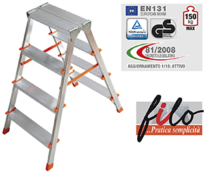 Sgabelli in alluminio a doppia salita. Molto stabili grazie ai 6 rivetti per ogni gradino e alle 4 diagonali di rinforzo. Gradini profondi mm.80. Montanti mm.40x20. Ingombro cm.16,5. Conformi alla normativa europea EN 131. Portata max kg.150.