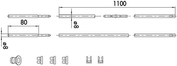 Kit aste interne diritte, rivestimento in zinco. In dotazione: coppia aste d.mm.8, puntale monoblocco d.mm.8 (pz.2), bocchetta a pavimento, spinotto di giunzione, pinza guida aste (pz.2), boccole anti-rumore. Per serrature art.57317, 57325, 57335.
