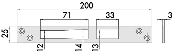 Contropiastra piana in acciaio inox mm.25x3. Per serrature art.46215, 46217, 46225, 46227, 46425, 46435, 46445, 46525, 46625, 46725.
