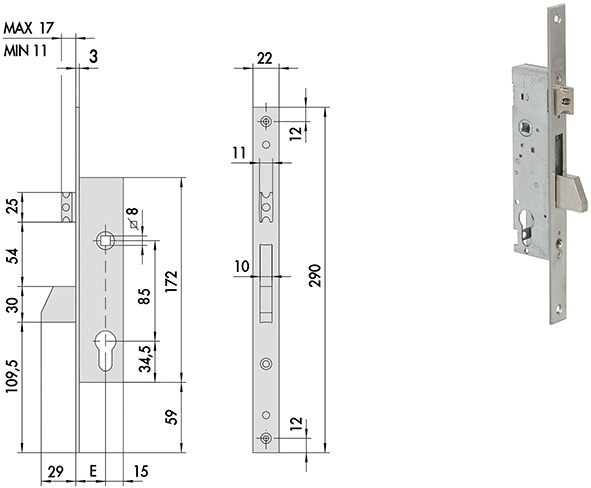 Serrature per montanti. 1 mandata. Catenaccio BASCULANTE. Scrocco regolabile da mm.11 a 17. Reversibile. Quadro maniglia passante mm.8. Interasse mm.85. Frontale in acciaio INOX. Predisposte per cilindro profilo europeo. Contropiastra non compresa.