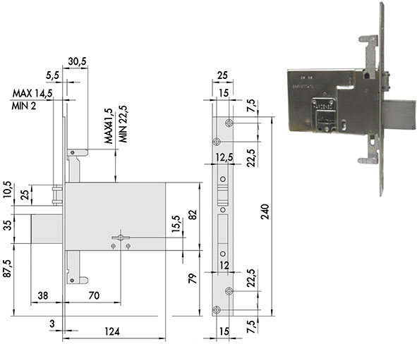 Serrature infilare per fasce TRIPLICE doppia mappa. 4 MANDATE. Catenaccio e rullo regolabile da mm.2 a 14,5. Reversibile. Frontale zincato. Con 3 chiavi art.00100.00.1 ns.cod.837905 (chiave grezza ricambio ns.cod.853580). Senza aste da ordinare a parte: zancate art.06451.00 ns.cod.838891; diritte art.06451.10 ns.cod.838893.