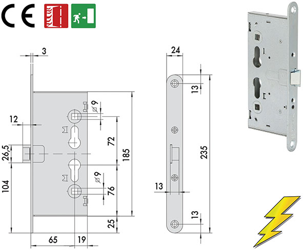 Elettroserrature da infilare per porte tagliafuoco e per maniglioni antipanico. Solo scrocco. Quadro maniglia sdoppiato mm.9. Funzionamento interno: con maniglione antipanico e/o maniglia. Funzionamento esterno: con la maniglia attivabile elettricamente e/o chiave. Reversibile.