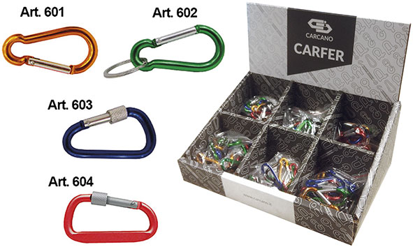 Espositore in cartone contenente n.240 moschettoni in alluminio colorati: art.601 mm.50/pz.50; art.601 mm.60/pz.50; art.602 anello mm.50/pz.30; art.603 ghiera mm.50/pz.30; art.604 piatto ghiera mm.50/pz.50; art.604 piatto ghiera mm.60/pz.30.