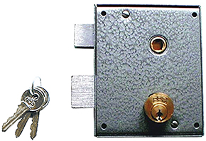 Serrature applicare per porte in ferro. Verniciate grigie. Scrocco pieno NON smussato. Catenaccio a due mandate. Cilindro d.mm.25, sporgenza lato esterno mm.11. Entrata mm.55. Scatola mm.100x120H. Interasse quadro-cilindro mm.60. Quadro mm.8. Cilindro ricambio ns.cod.839340. In dotazione 3 chiavi (ricambio ns.cod.880472).