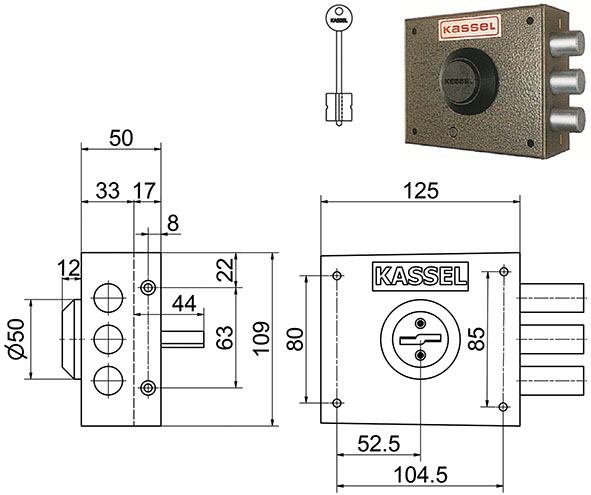 Doppia mappa. Verniciata. Laterale con 3 catenacci. Entrata mm.60. Catenacci corsa mm.40, diametro 18, interasse mm.26. In dotazione 3 chiavi art.45 ns.cod.839543 (ricambio ns.cod.882640), ferrogliera, bocchetta e viti.