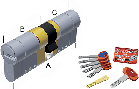 Cilindri modulari FRIZIONATI. 11 perni attivi e pista. Tagli per rottura controllata. Antitrapano, antipicking e bumping. Sicurezza chiave classe 6. In dotazione tessera, 5 chiavi padronali, 1 cantiere, 1 chiave cambio. Chiavi a duplicazione PROTETTA presso i centri abilitati Team Securemme. Duplicato chiave in aggiunta ns.cod.862190/192/194.