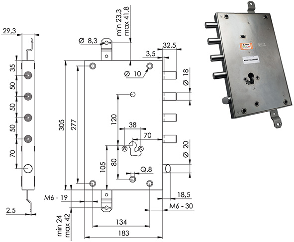 Serratura reversibile triplice AD INGRANAGGI per porte blindate. 4 mandate e scrocco reversibile. Per cilindro europeo. Cilindro, mostrine e aste non compresi. Serie M ricambio SB senza avanzamento manuale catenacci. Quadro superiore FISSO per pomolo. Defender interasse mm.38 viti M6. COMPATIBILE MOTTURA SERRABLINDA.