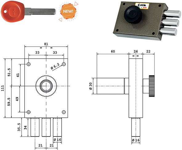 Serratura da applicare con cilindro tondo MOIA d.mm.30 L mm.50, chiave punzonata, pomolo interno. Laterale. 2 mandate. Entrata mm.63. Cilindro a 11 perni attivi. In dotazione: 2 chiavi nere disattivabili con la chiave ONE/OFF e 5 chiavi arancio. Chiavi ricambio: arancio ns.cod.843973, nera ns.cod.843964.