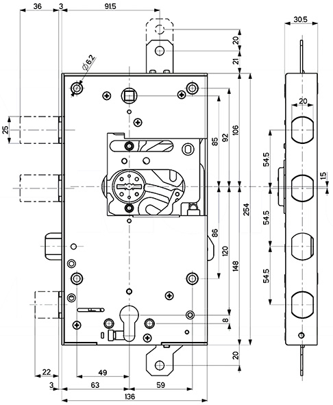 Serratura DOPPIA da applicare, triplice. Superiore doppia mappa inferiore a cilindro sagomato. Catenacci speciali piatti sui lati. Serratura superiore 2 catenacci e scrocco, inferiore 1 catenaccio. Entrata mm.63. A leve. INDIPENDENTE. Con trappola. Mezzo giro reversibile. Catenacci corsa mm.36 interasse mm.54,5. Interasse fori defender mm.38. Nuclei ricambio ns.cod.845808 e 845809.