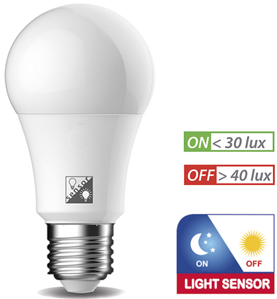 Attacco E27. 20000h. Classe energetica F. LIGHT SENSOR: sensore CREPUSCOLARE interno. Tempo di accensione circa 1 sec.
