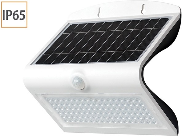 Proiettori led SMD ricarica solare. Struttura in ABS e policarbonato anti UV bianco. Con batteria ricaricabile al litio (sostituibile) 3,7V-4000 mAh. Con pannello solare 4,4Wp Mono (tempo di ricarica solare 12/15h). Con sensore crepuscolare di movimento angolo 120? portata mt.6. 2 modalit? di funzionamento. Protezione IP65.