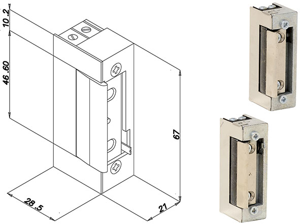 Simmetrico e reversibile. Bloccato senza alimentazione. Con anti-ripetitore automatico incorporato. Incontro elettrico a sganciamento PERMANENTE. Dopo l'impulso elettrico la porta pu? essere aperta in qualsiasi momento soltanto 1 volta. Blocco scrocco regolabile orizzontalmente. Senza frontale (da ordinare a parte: corto ns.cod.839751 oppure lungo ns.cod.839753). Alimentazione 8-12 Vac.