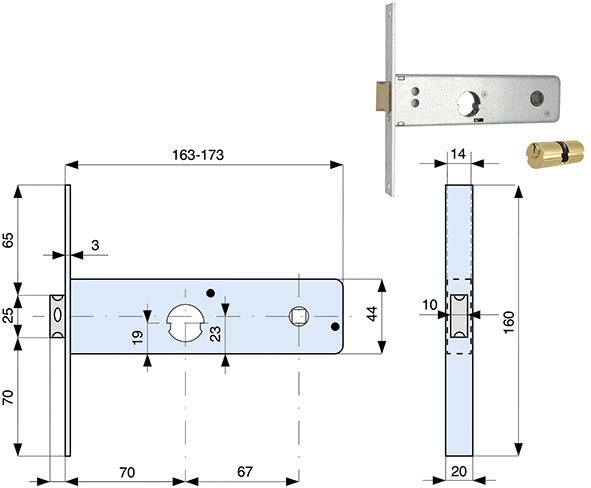 Serrature da infilare a cilindro per fasce. 2 mandate e scrocco regolabile. Frontale in acciaio zincato mm.20. Quadro maniglia mm.8. In dotazione cilindro ribaltabile doppio tondo MG 020520 ns.cod.839245.