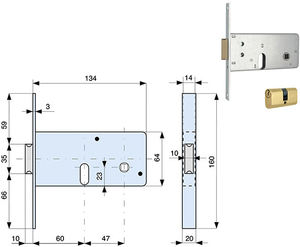 Serrature da infilare a cilindro per fasce. 2 mandate e scrocco. Catenaccio in ottone. Frontale in acciaio zincato mm.20. Quadro maniglia mm.8. In dotazione cilindro ovale MG 018560 ns.cod.839221.