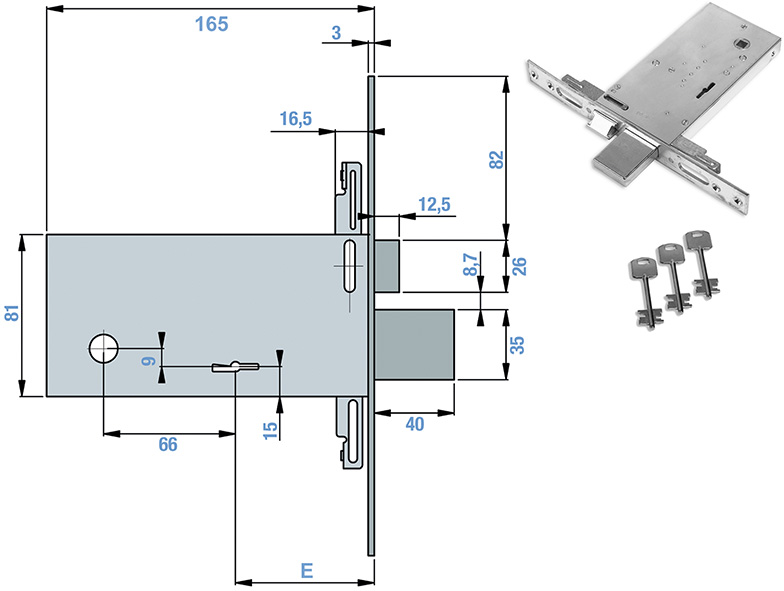 Serrature TRIPLICI a doppia mappa, per fasce. 4 mandate. Catenaccio e scrocco. Scatola altezza mm.81. Frontale inox. Quadro maniglia mm.8. Con 3 chiavi (chiave grezza ricambio ns.cod.882260).