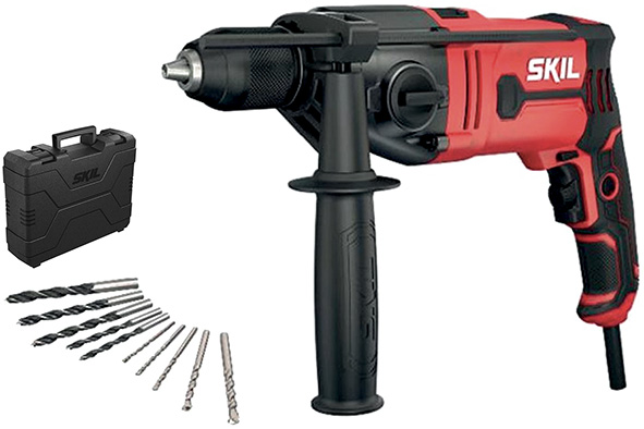 In valigetta. Elettronico. Percussione. Reversibile. Mandrino autoserrante in metallo mm.13. N.2 velocit? 0-1200/0-3200 giri/min. N.max colpi 0-20400/0-54400/min. Max foratura legno/cemento/acciaio mm.50/20/13. In dotazione: impugnatura laterale, asta di profondit?, set 5 punte per foratura nel legno, set 5 punte per foratura nella muratura.