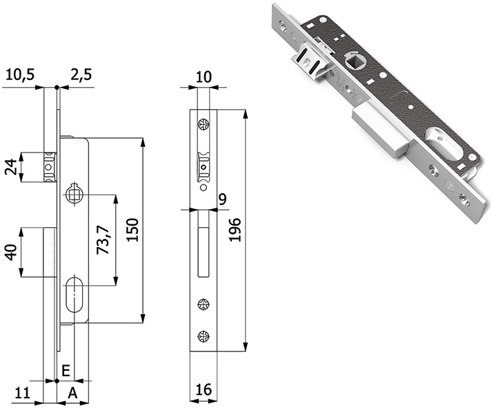 Serrature per montanti. 1 mandata. Catenaccio e scrocco reversibile. Frontale inox mm.16x196. Quadro maniglia mm.8. Catenaccio comandato dalla chiave e scrocco comandato dalla maniglia. Predisposte per cilindro ovale ns.cod.857850-857852.