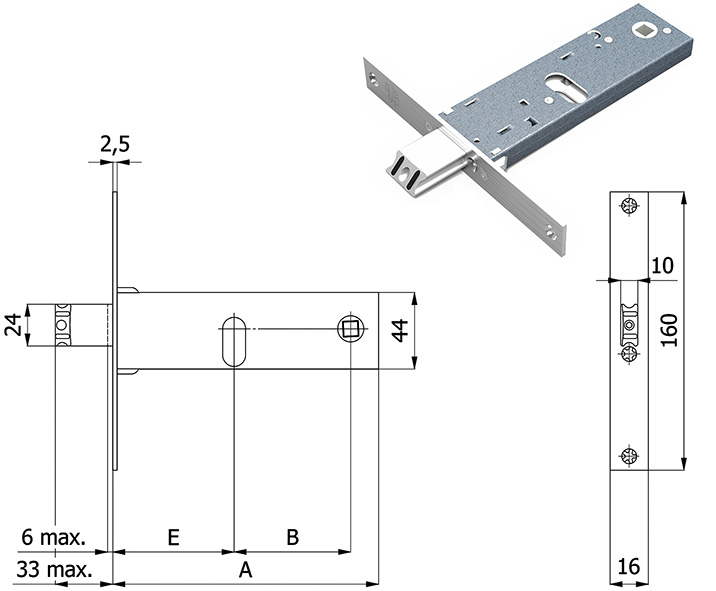 Serrature per fasce. Solo scrocco 2 mandate, regolabile mm.6-33. Reversibile. Frontale inox mm.16x160. Quadro maniglia mm.8. Scrocco comandato dalla maniglia o dalla chiave. Mandate comandate dalla chiave. Predisposte per cilindro ovale ns.cod.857850-857852.