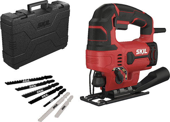 In valigetta. Selettore di materiale con 4 regolazioni. Velocit? 0-3000 corse/min. Capacit? di taglio legno mm.75, alluminio mm.12, acciaio mm.6. Ampiezza corsa mm.18. Angolo base inclinabile destra/sinistra fino a 45?. Cambio lama con sistema Clic. Predisposto per l'aspirazione. In dotazione: kit 7 lame, adattatore per l'aspirazione, chiave esagonale.