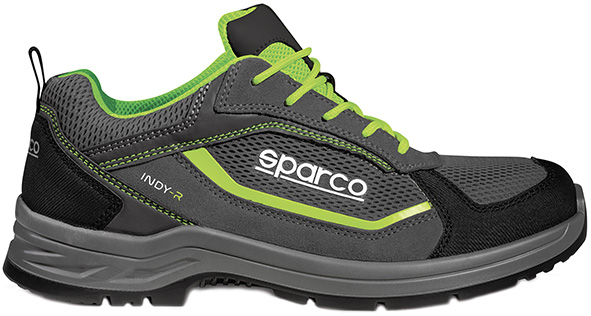 Linea INDY-R. ESD S1PS SR FO LG. Tomaia in mesh traforata, pelle scamosciata e microfibra. Colore grigio scuro/verde fluo. Puntale in vetroresina amagnetico, resistente a 200J. Sottopiede anti-perforazione in fibra tessile (PS chiodo conico d=mm.3). Suola in poliuretano bi-densit? con assorbimento di energia sul tallone + LG grip per scale a pioli. Metal free. EN ISO 20345:2022 CE.