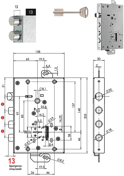 Serratura applicare triplice DOPPIA MAPPA AD INGRANAGGI. RICIFRABILE con SIM ns.cod.879344. 4 mandate. Scrocco reversibile azionato da chiave e quadro maniglia. Entrata mm.65. 3 catenacci SPORGENZA +10 interasse mm.37. Corsa mm.36. Corsa leve rinvio mm.20. In dotazione 3 chiavi (ricambio ns.cod.879348). Chiavistelli indipendenti dalle aste. COMPATIBILE CISA.