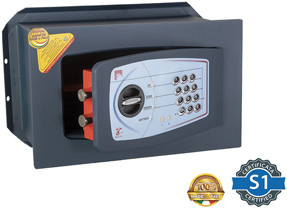 Casseforti da muro CERTIFICATE in classe S1 secondo la norma UNI EN 14450. Made in Italy. Frontale e porta spessore mm.10. Battute rinforzate per una maggiore resistenza allo sfondamento. Apertura/chiusura con manopola di comando e blocco con elettromagnete. Contatti per batteria esterna. Protezione al meccanismo della serratura con piastra in acciaio al manganese. Catenacci d.mm.22.
