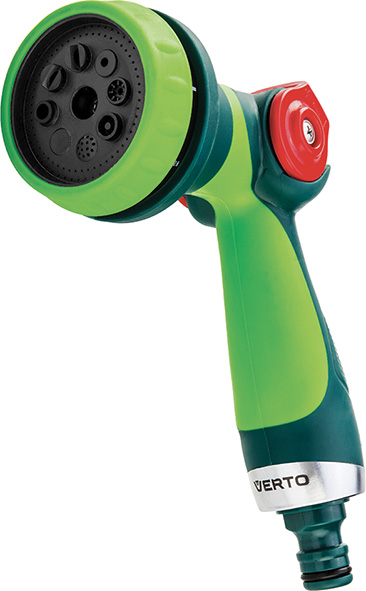 Irrigatore a pistola 8 funzioni con regolazione fluida del getto tramite il pollice. Possibilit? di scegliere un getto di diversa intensit? e funzione, chiara indicazione del tipo di getto. Impugnatura bimateriale.